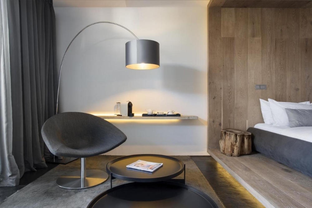 This luxurious room comes complete with stylish and contemporary décor and leads onto a large outdoor sunbathing patio with mountain view, as well as a heated plunge pool. The open plan private bathroom is fitted with a rain shower. This room is located on the ground floor.
